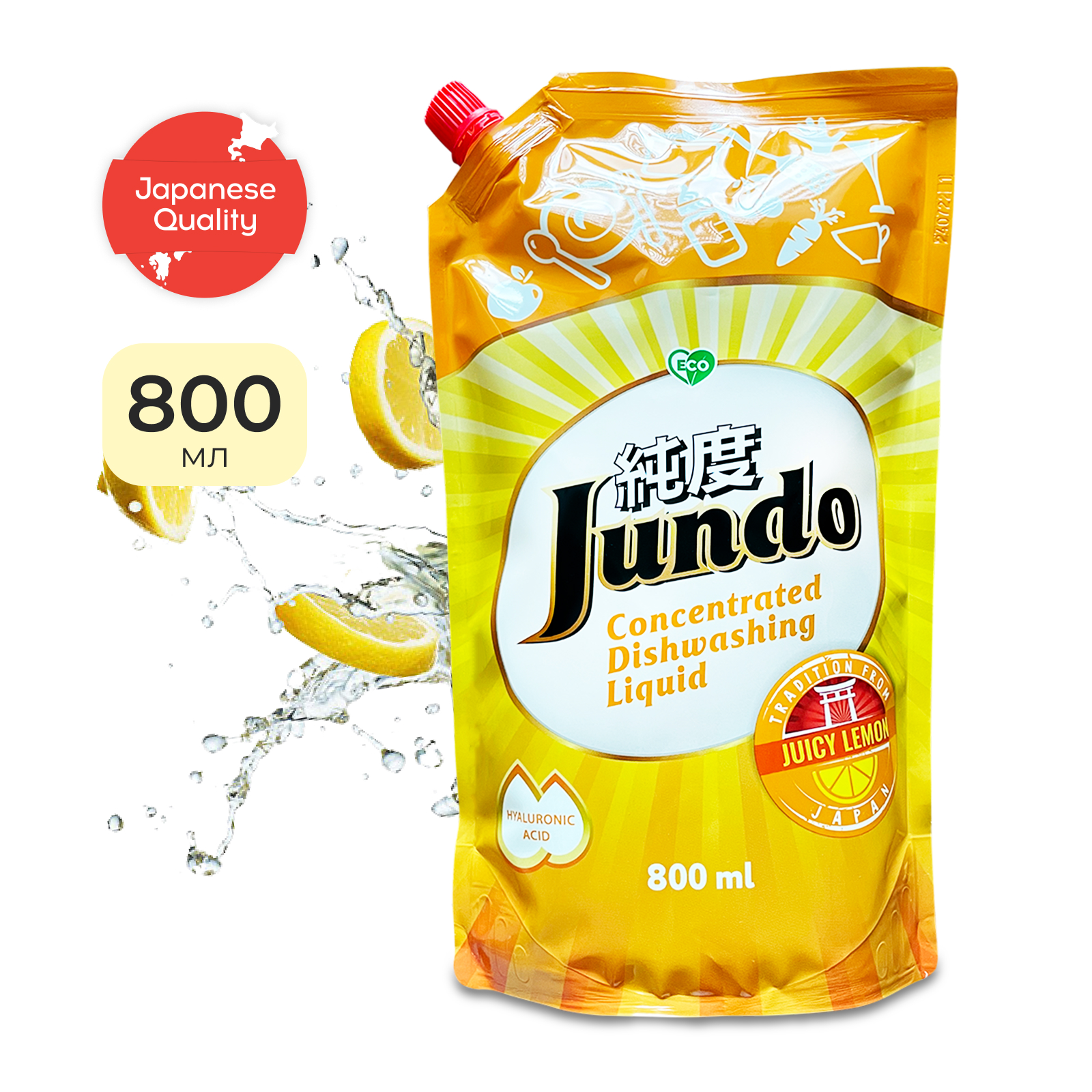 Концентрированный ЭКО-гель Jundo c ароматом сочного лимона эффективно и быстро справляется с мытьем посуды, устраняет жир, остатки пищи и запахи, даже в холодной воде.