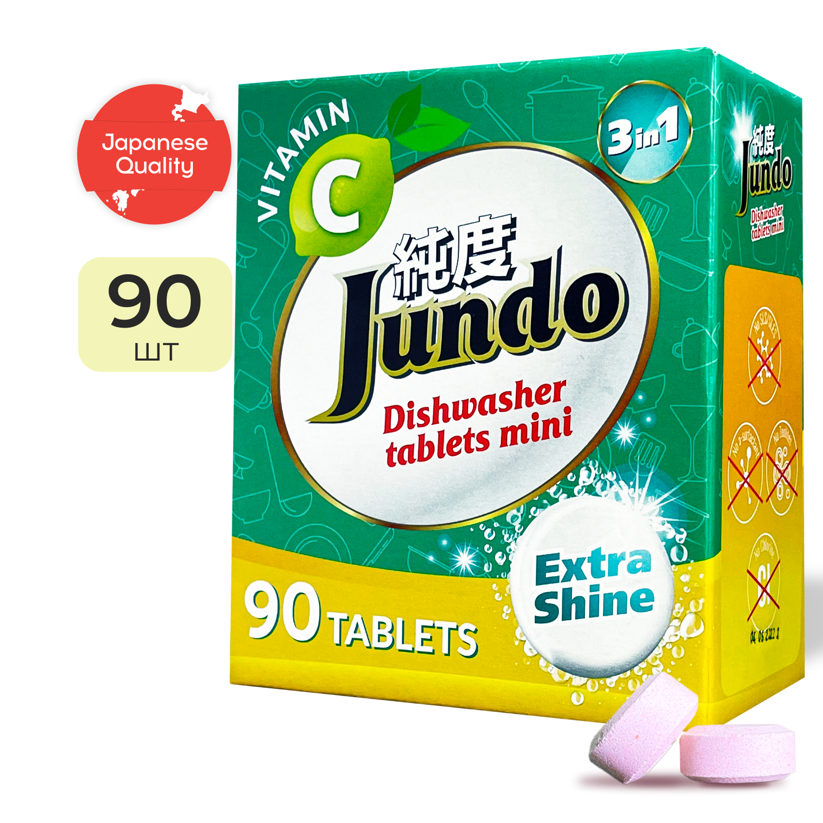 Инновационные бесфосфатные таблетки Jundo Vitamin C эффективно и бережно справляются с пятнами от кофе и чая, жира, пригоревшей пищи, застарелых и сложных загрязнений с первого раза. Мини формат разработаны для использования при неполной загрузке посудомоечной машины. Больше не нужно разламывать большую таблетку или допускать перерасход.