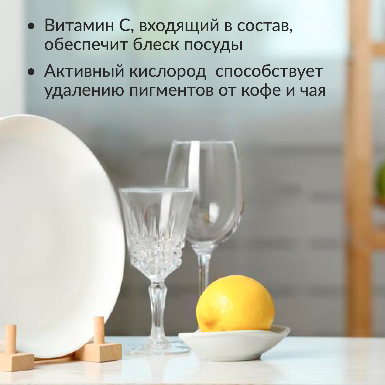 Витамин С, входящий в состав, обеспечит экстра-сияние и блеск посуды, защитит детали посудомоечной машины от износа и коррозии. Активный кислород способствует удалению пигментов от кофе и чая. Работают даже при низкой температуре.